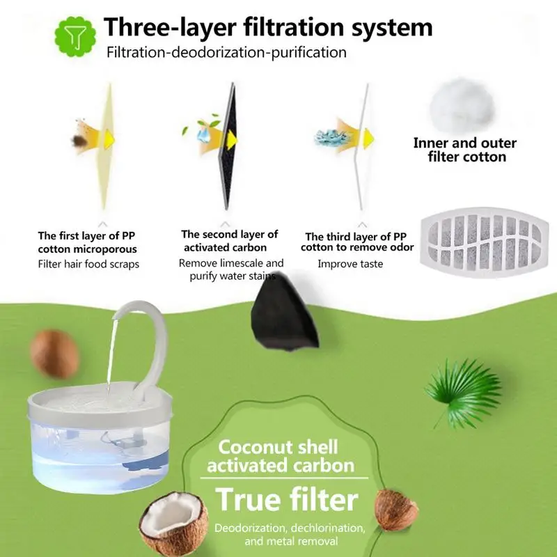 1. Filter cotton for pet water dispenser: The activated carbon in the filter can remove bad odor and peculiar smell and keep the water clean and fresh. 2. Plastic cotton net: Filter out any deposits that may exist in the tap water, and thoroughly capture hair, sediment and debris.