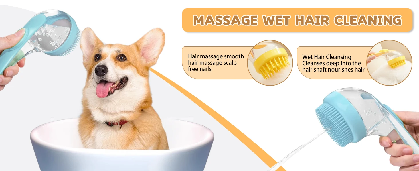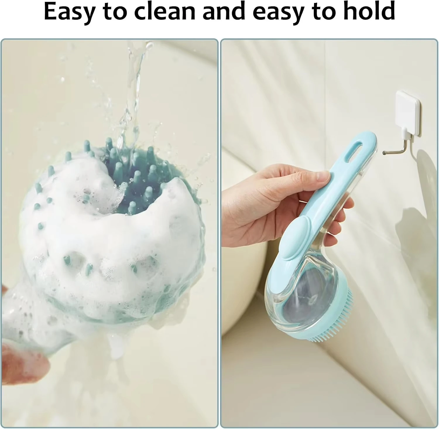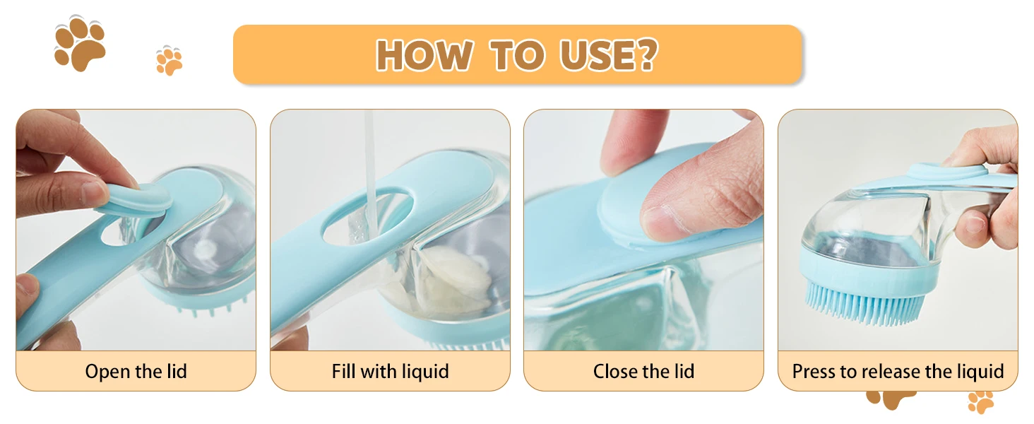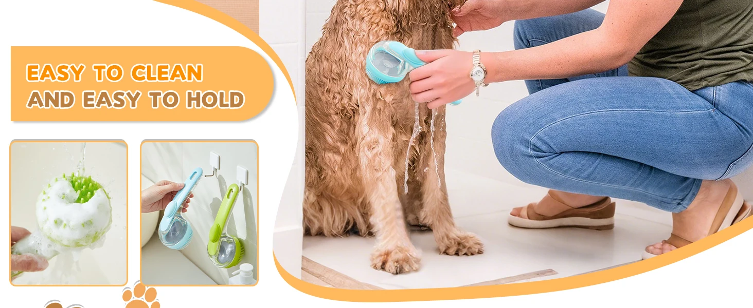 【Ergonomic & Convenient Design】 Featuring a unique non-slip handle, this dog bath brush ensures a comfortable grip during bath time. Simply squeeze the handle to dispense the shampoo effortlessly, helping you save on shampoo usage while keeping your pet clean.