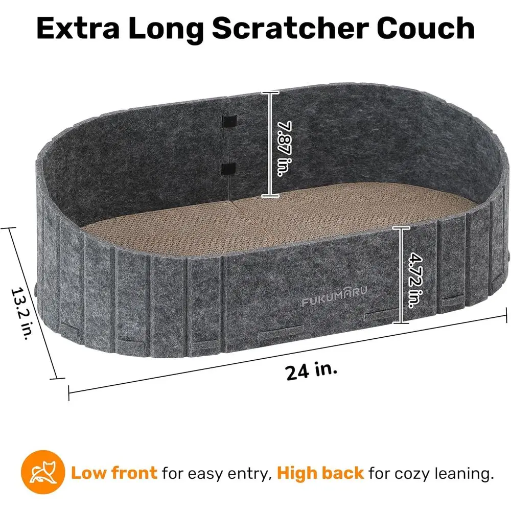 Semi-Enclosed Design: This cat scratcher couch features a semi-enclosed oval design that is lower at the front and higher at the back, making it easy for cats to walk in and out. Cats can lie down with their paws resting on the edge of the scratching bed, feeling very comfortable for lounging or sleeping. Measuring 24 inches long and up to 7.87 inches in height at the back, it is large enough for cats to sleep on.