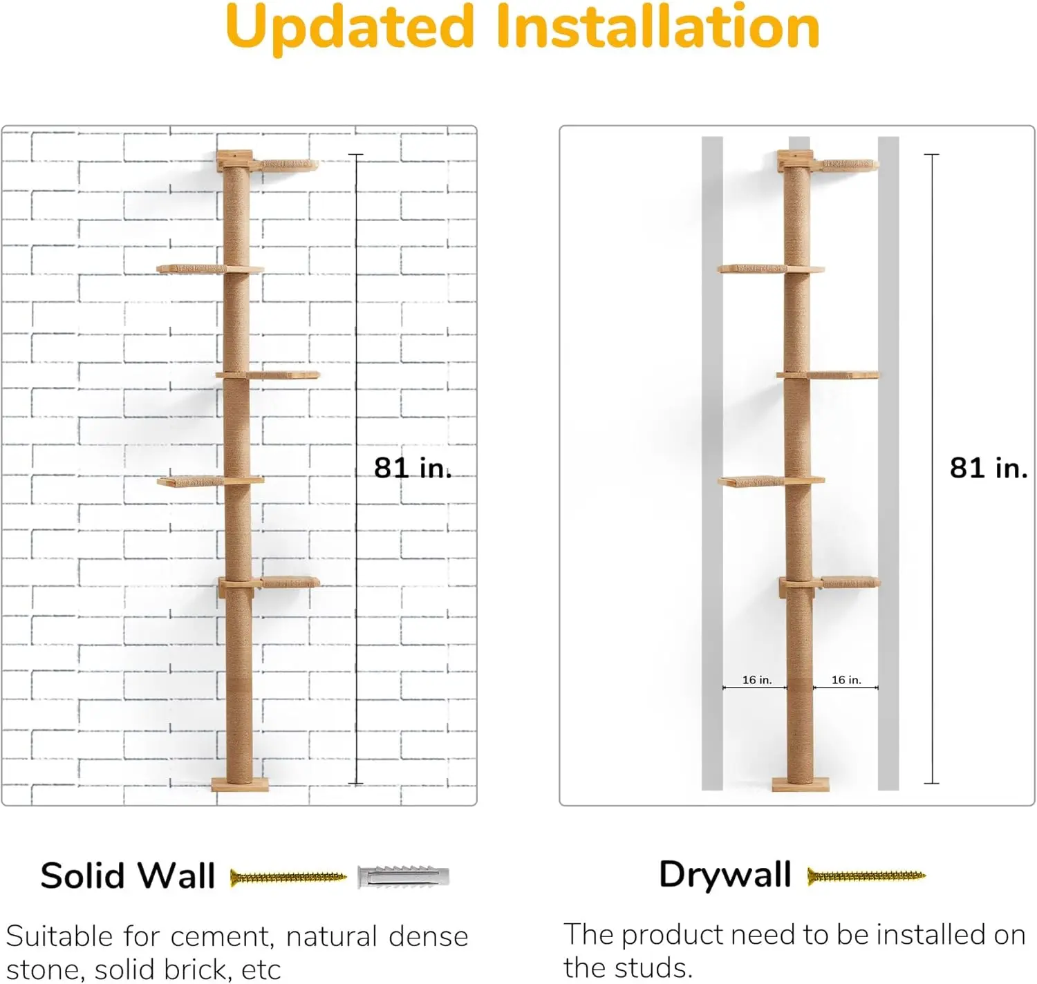 Elevate your cat’s playtime with this versatile and space-saving cat tree designed to meet all their natural instincts. This product features a sturdy 5-tier structure that extends from floor to ceiling, providing ample vertical space for climbing and exploration. The wall-mounted design ensures stability and saves valuable floor area in your home. Key benefits include: 1. Multi-Level Fun: With five tiers of varying heights, cats can climb, jump, and perch at different levels, mimicking their wild environment for enhanced stimulation and exercise. 2. Integrated Scratching Surfaces: Durable scratching posts are built into the tower to satisfy your cat’s need to scratch, helping protect your furniture while keeping claws healthy. 3. Wild Simulation Shelves: These shelves offer lookout points that simulate natural perches, encouraging cats to observe their surroundings from a safe height, perfect for play or relaxation. 4. Space-Efficient Design: The wall-mounted setup maximizes vertical space without cluttering rooms, making it ideal for apartments or homes with limited floor area. Constructed from high-quality materials like sisal rope for scratching surfaces and sturdy wood or particle board for frames, this cat tree is built to withstand active use by multiple cats or larger breeds. It supports activities such as climbing up the tiers, scratching on designated posts, lounging on shelves for naps or bird-watching through windows—all contributing to mental enrichment and physical health benefits like reduced stress through playtime engagement indoors year-round regardless of weather conditions outside! Assembly is straightforward with included instructions; regular maintenance involves occasional vacuuming of fabric parts if applicable (check specific model details). Suitable for kittens learning coordination skills up through adult felines seeking adventure indoors—this product enhances living spaces by promoting natural behaviors safely within domestic settings.