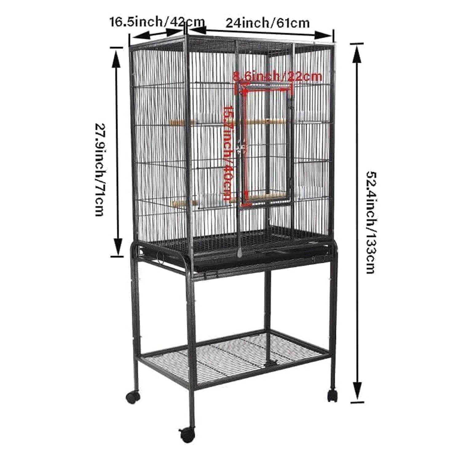 53″ Bird Flight Cage, Metal Bird Cage with Wheels, Rolling Stand, Bird Feeder, Slide-Out Tray & Wooden Perches Birds Supplies