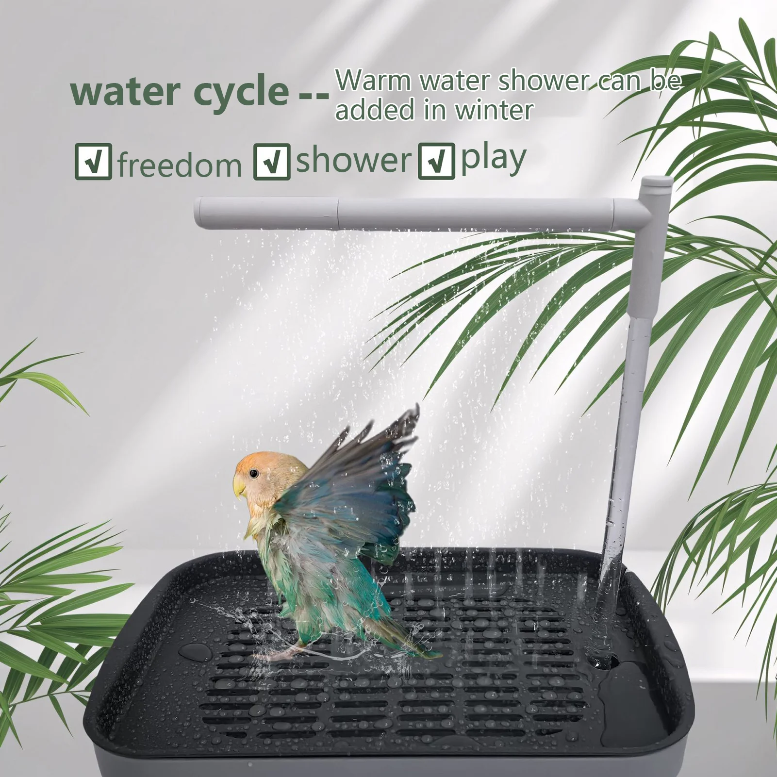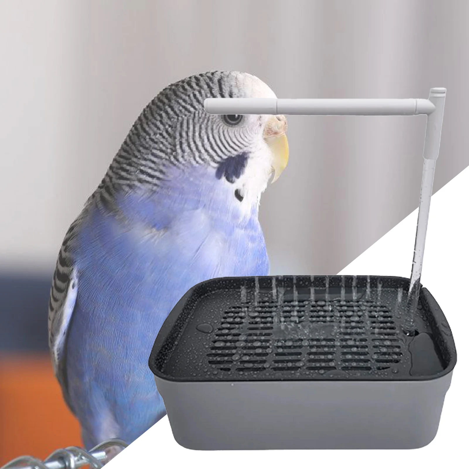 Large Bird Shower Circulating Water Fountain: This automatic bird bath fountain features a large shower design with circulating water, providing a refreshing and fun bathing experience for parrots, parakeets, and other birds.