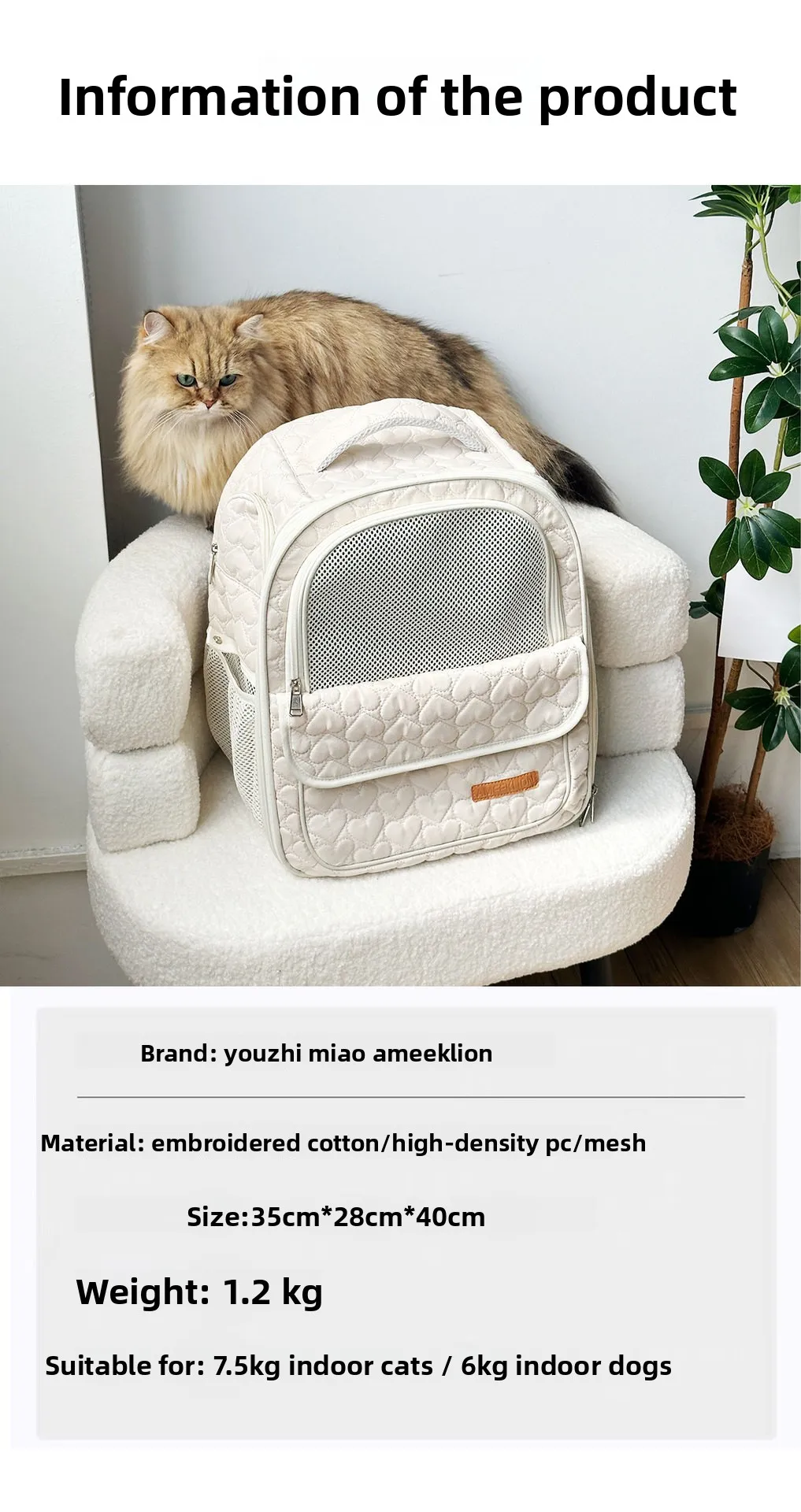 SPECIFICATIONS Brand Name: other Breed size: Small Breeds CN: Hebei Choice: yes Closure Type: Zipper High-concerned chemical: None Item Type: Backpacks Lifestage: Kitten Material: 100% Cotton Origin: Mainland China Type: cats