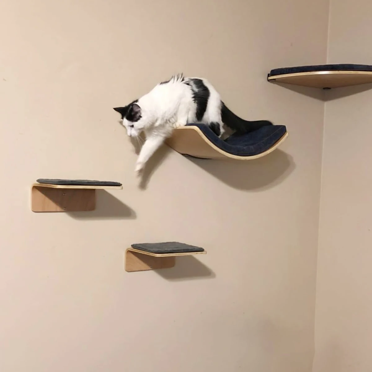 Consists of a right-angle cat wall bed and two cat wall steps. The perfect gift for pets who love to climb, suitable for cats up to 22 pounds. Features felt cloth to protect your pet's paws.