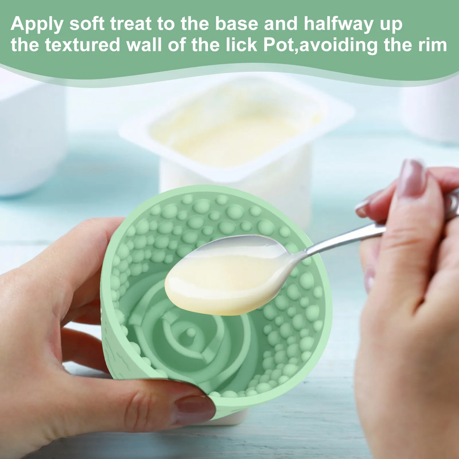 - Versatile for Various Foods – Our enrichment lick bowls for dogs is compatible with a wide range of foods, including wet, soaked kibble, and even dry kibble when combined with yogurt or other pet-safe foods. Feel free to use it with a variety of ingredients such as cheese, sardines, berries, smoothies, fish treats, and more.