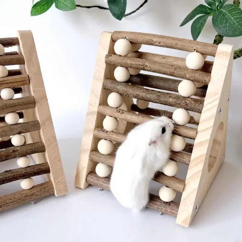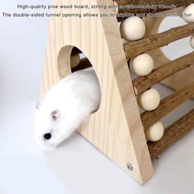 Features a sanded branch ladder supporting up to 5kg, for dwarf hamsters, gerbils, hide, and exercise in their wooden trapezoidal habitat.