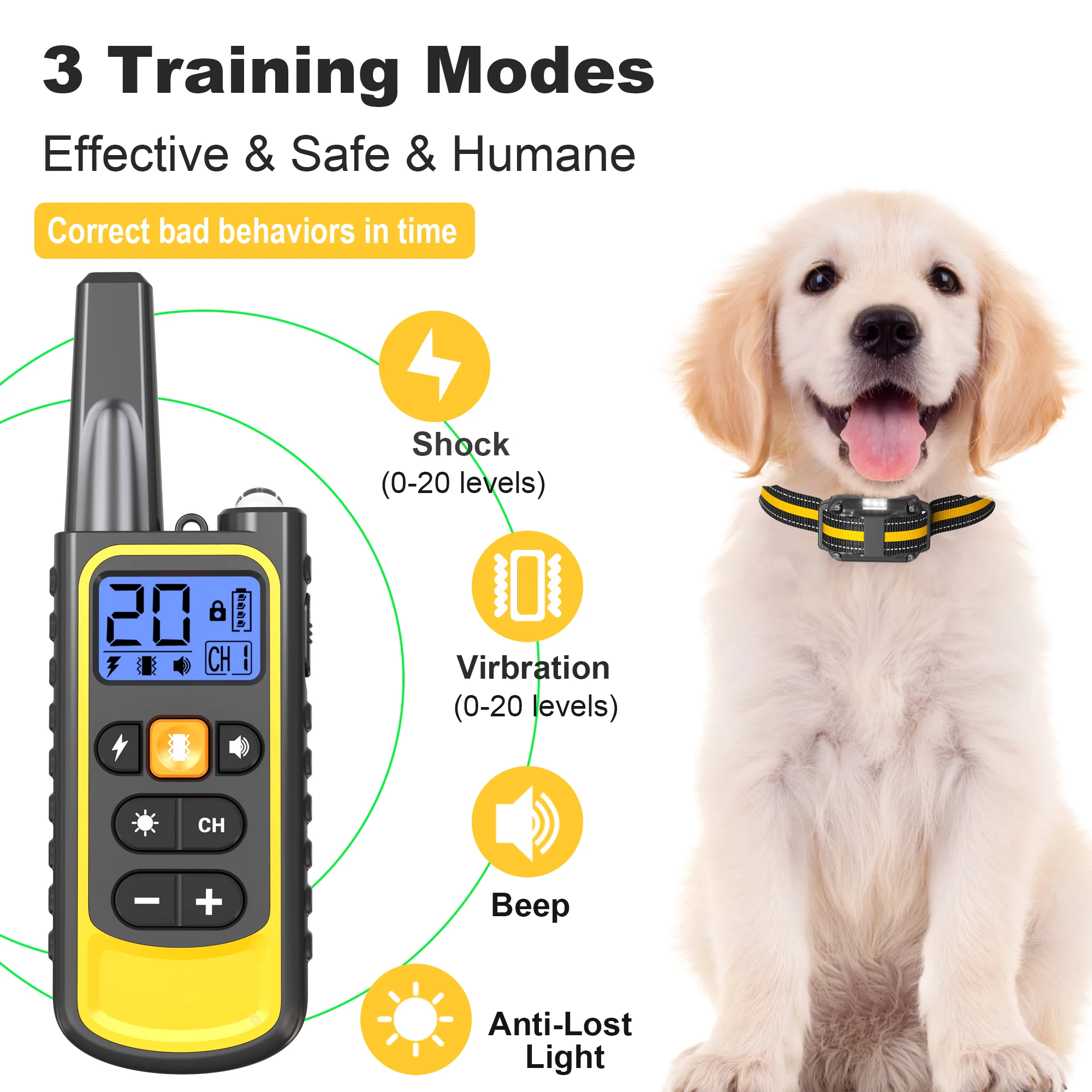 3 training modes: shock / vibration / sound