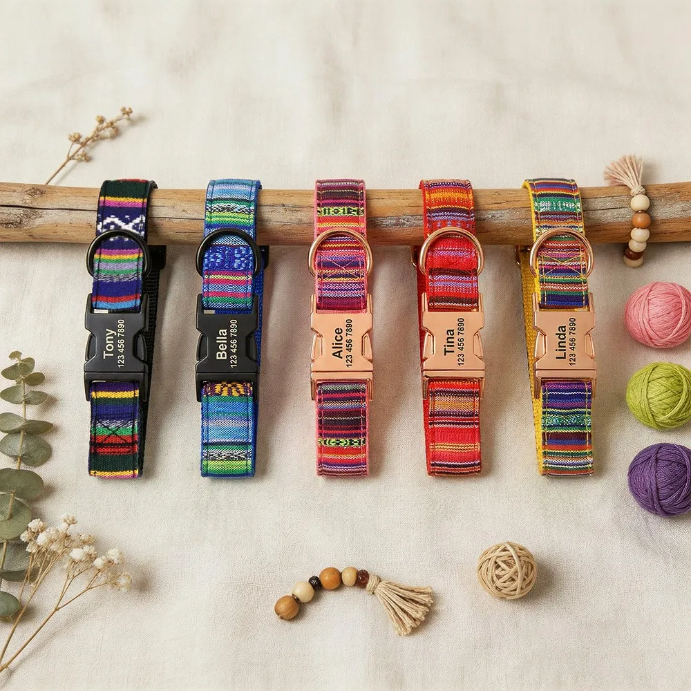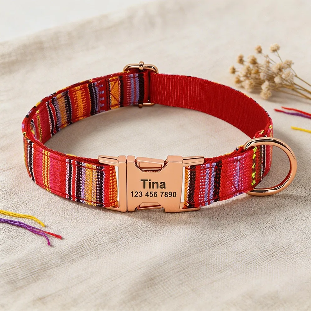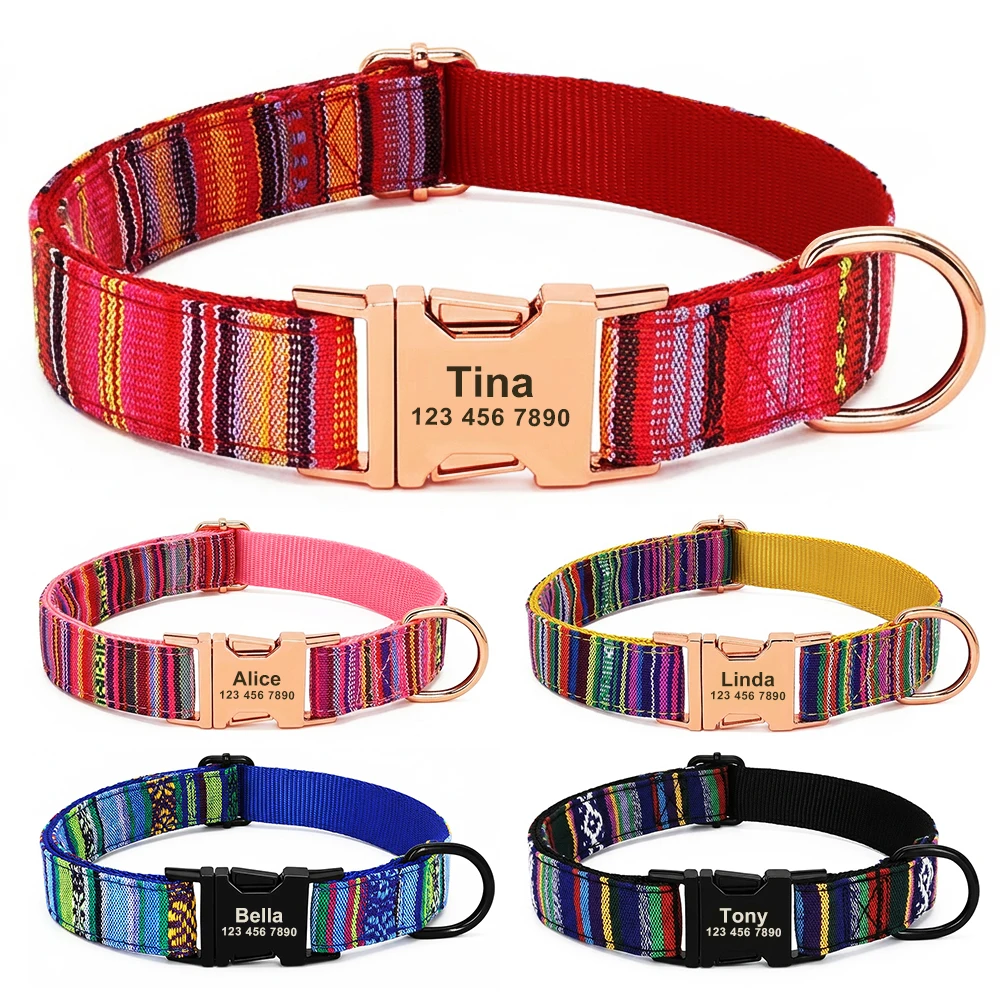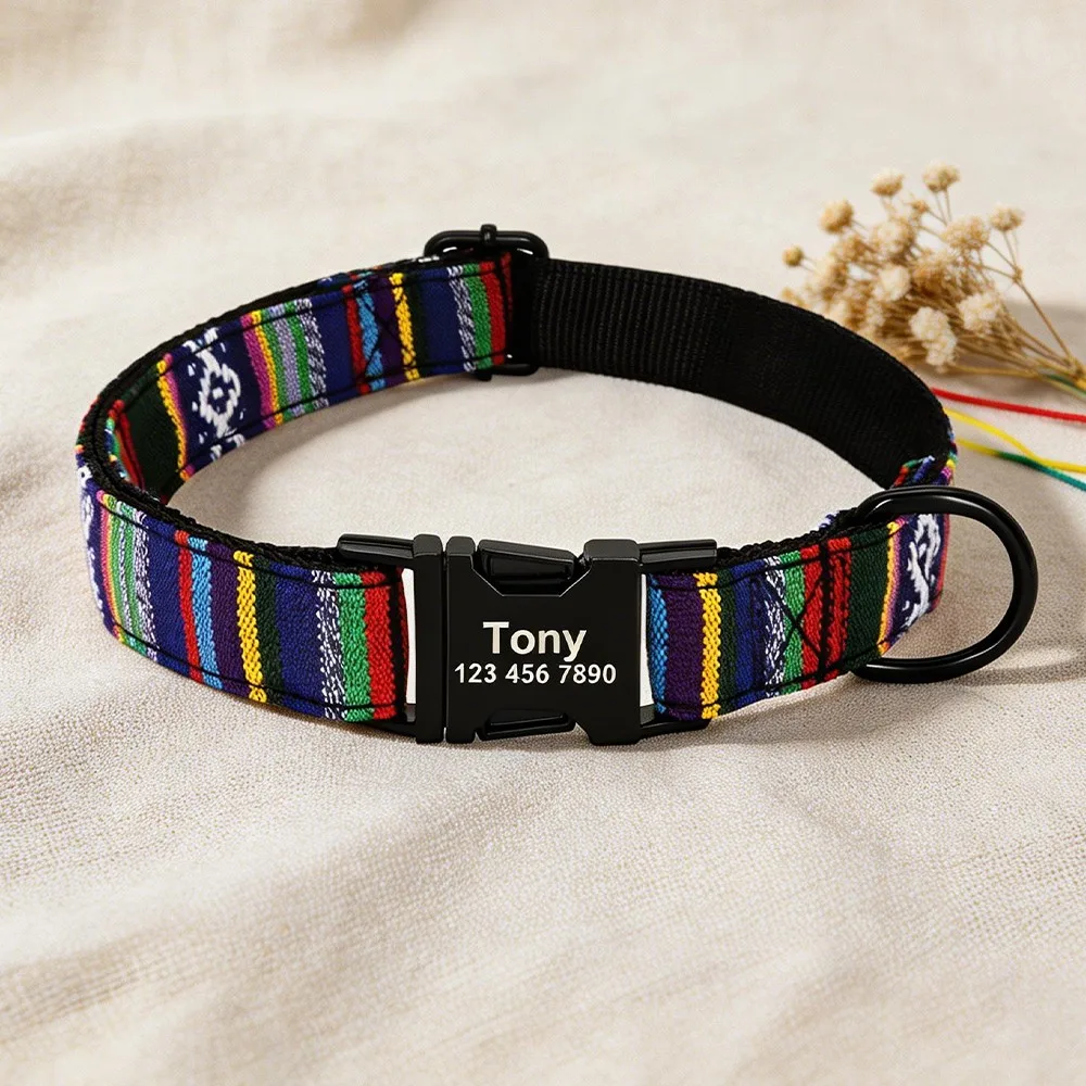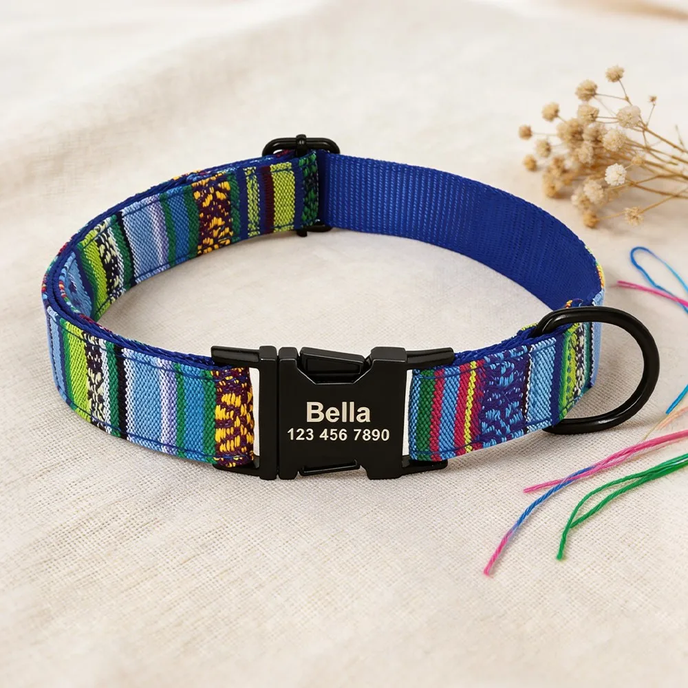 Ethnic Style Personlized Nylon Dog Collar Name ID Metal Buckle Engraved Free Adjustable for Small Medium and Large Dogs