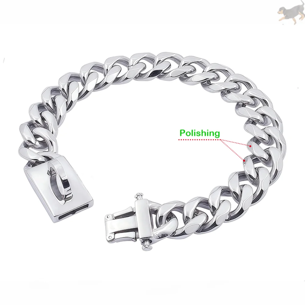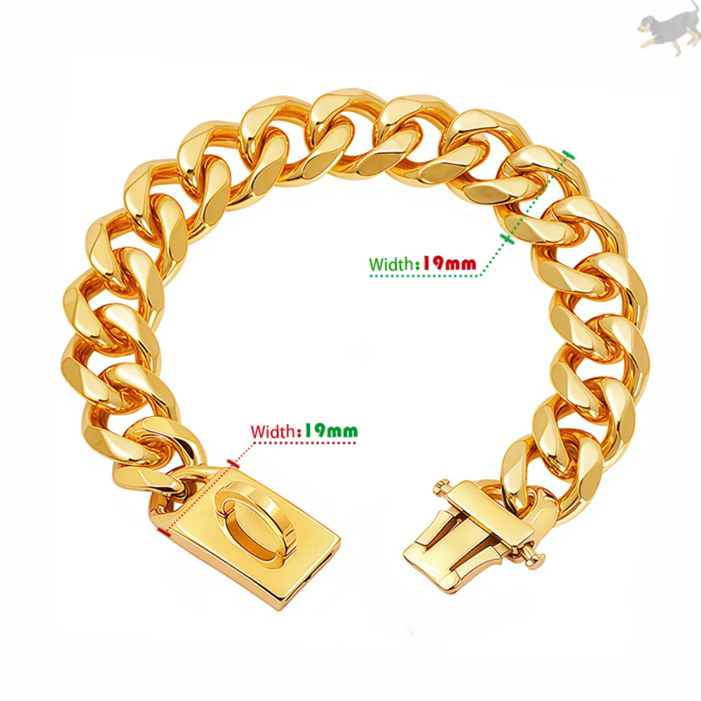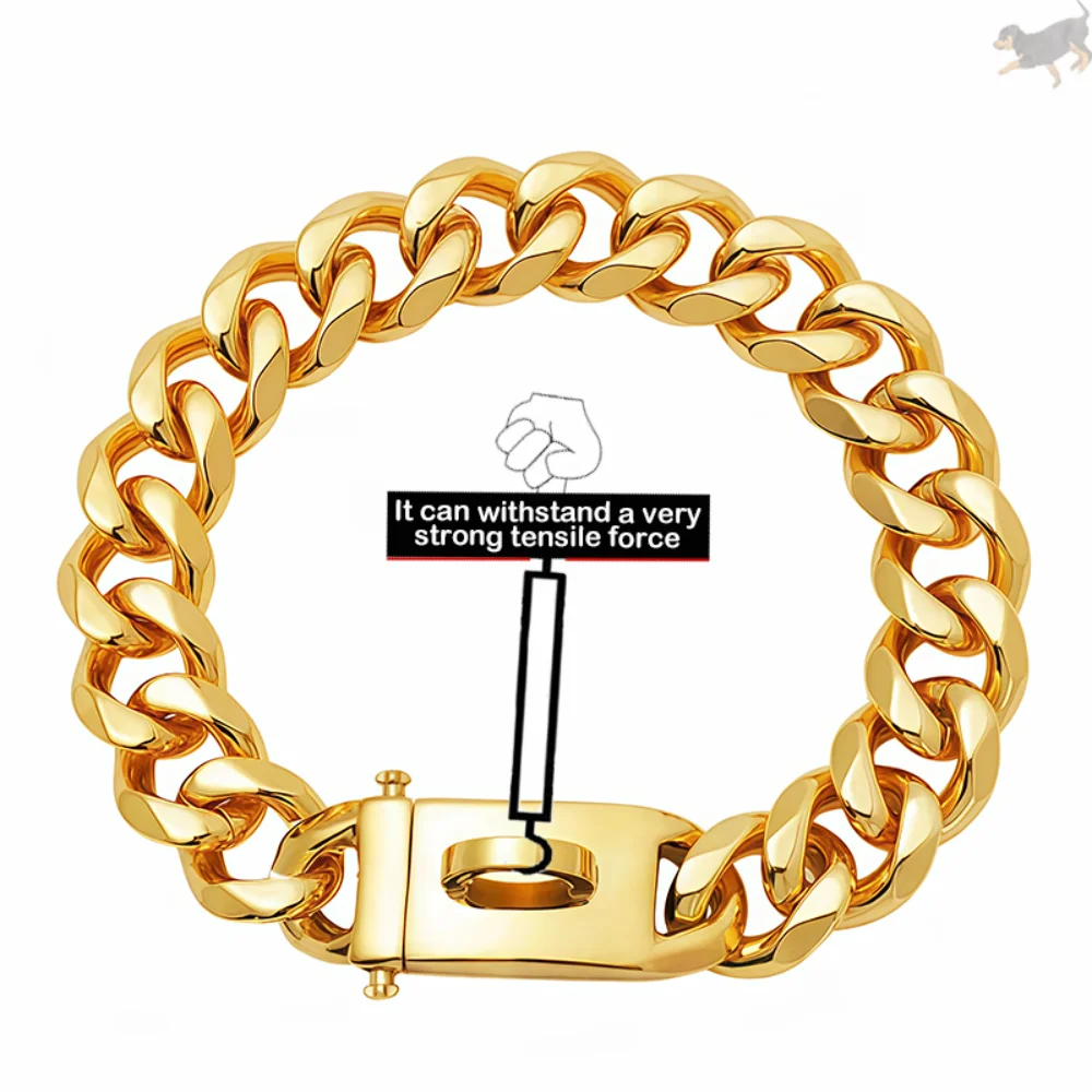 Stainless steel 304 dog chain, with maximum strength and durability.It's a super strong dog collar, and can prevent dogs from biting.Even if it bears 180 pounds (about 80 kg) of force, it will not be affected.The golden chain is plated with 18k gold,the silver chain is polished on the surface of the raw material.