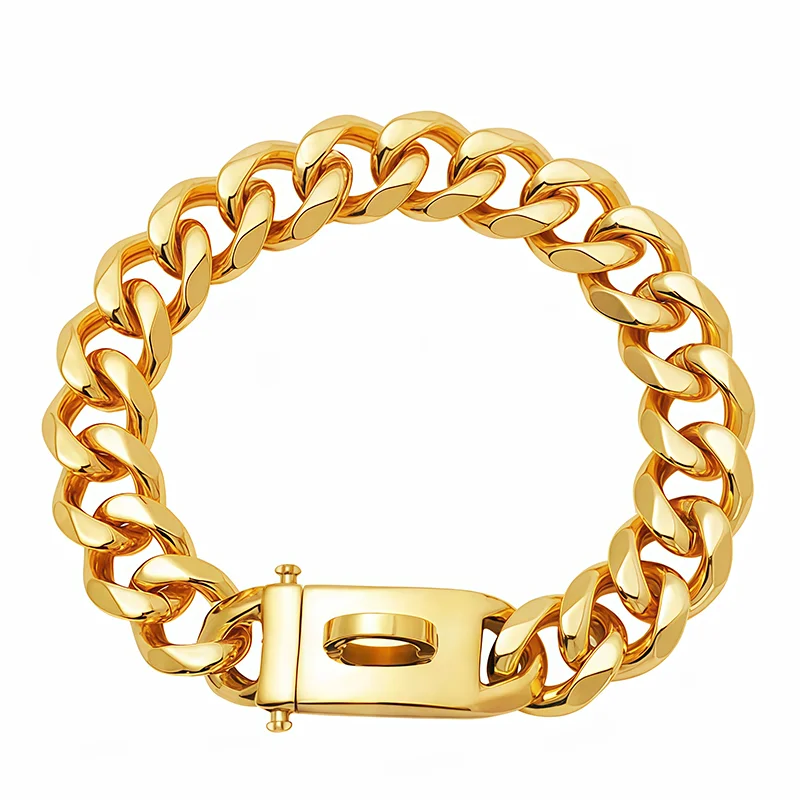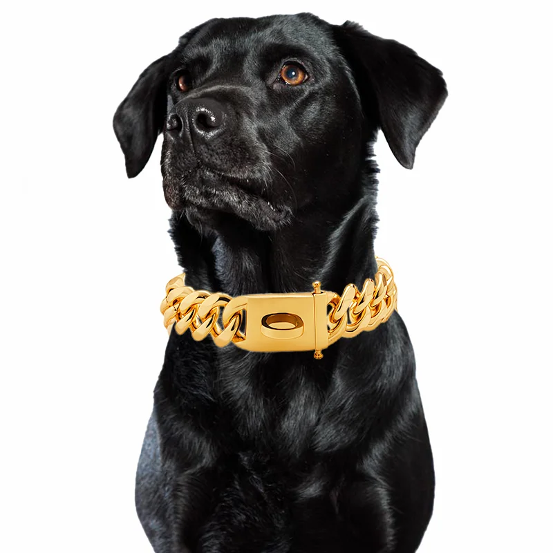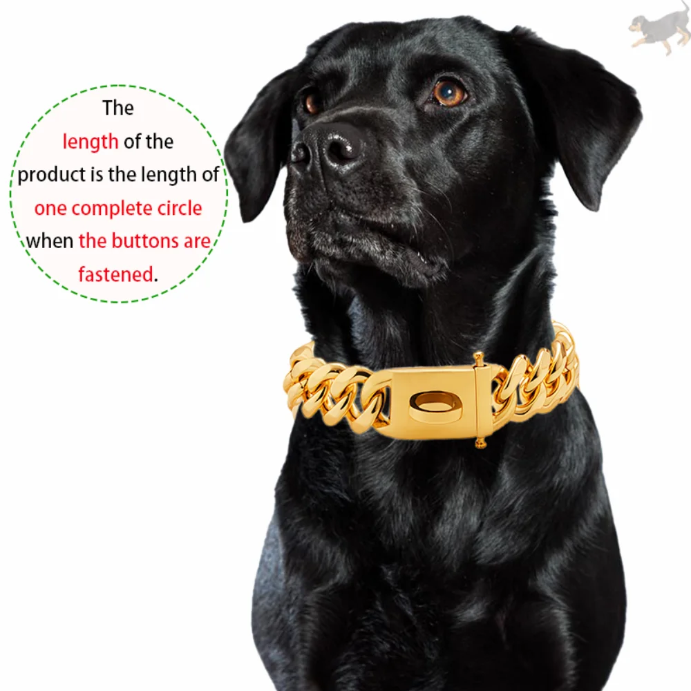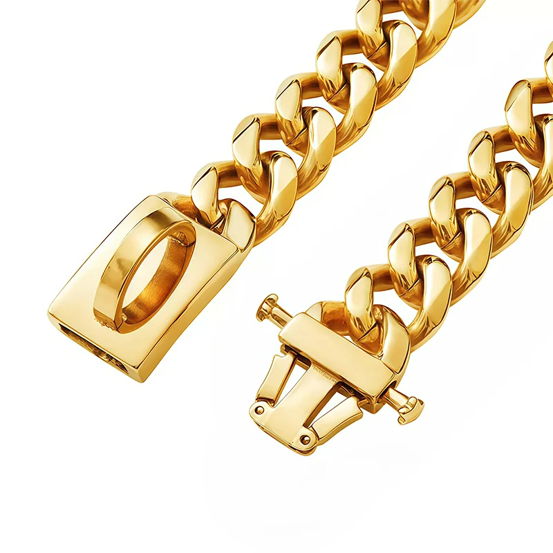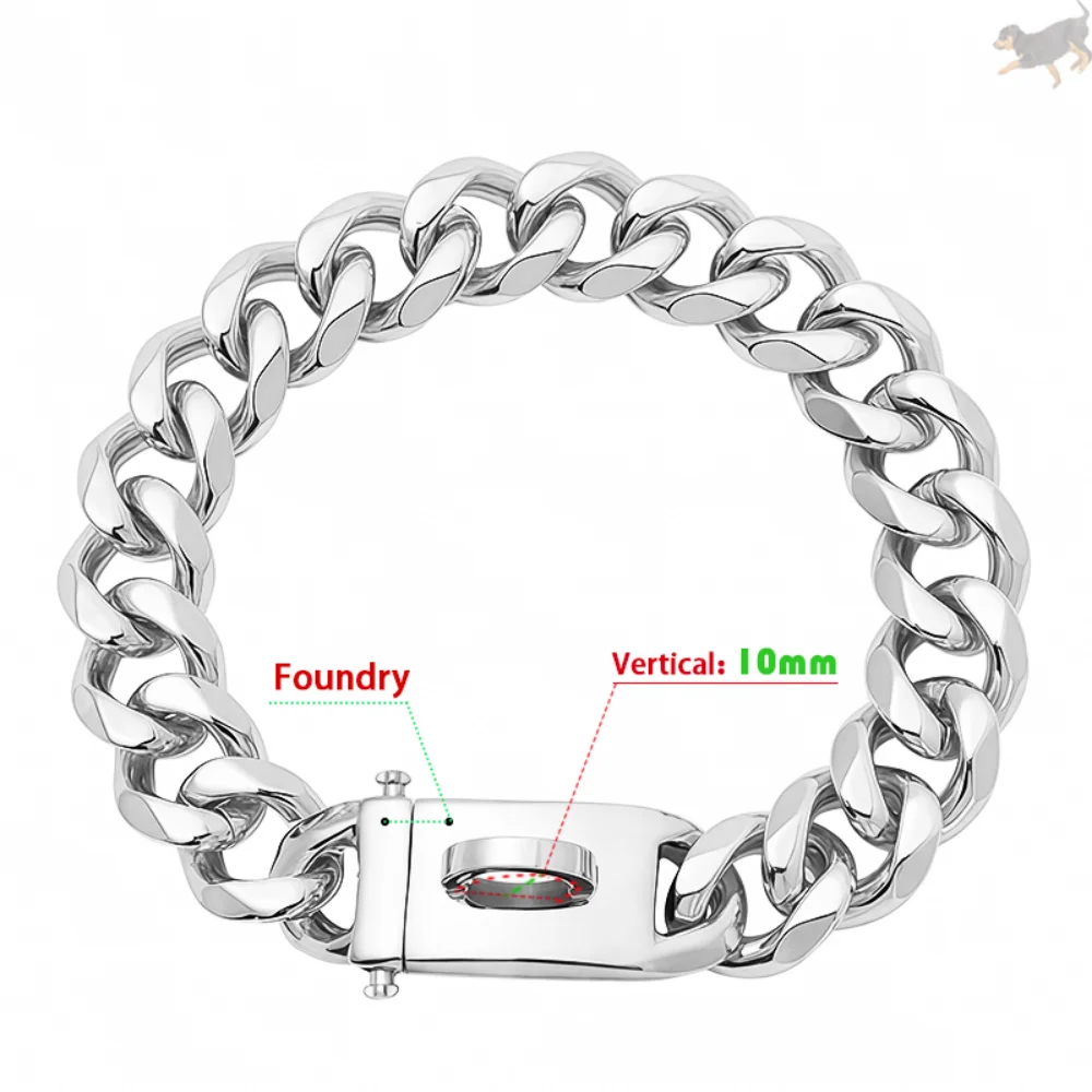 Stainless steel 304 dog chain, with maximum strength and durability.It's a super strong dog collar, and can prevent dogs from biting.Even if it bears 180 pounds (about 80 kg) of force, it will not be affected.The golden chain is plated with 18k gold,the silver chain is polished on the surface of the raw material.
