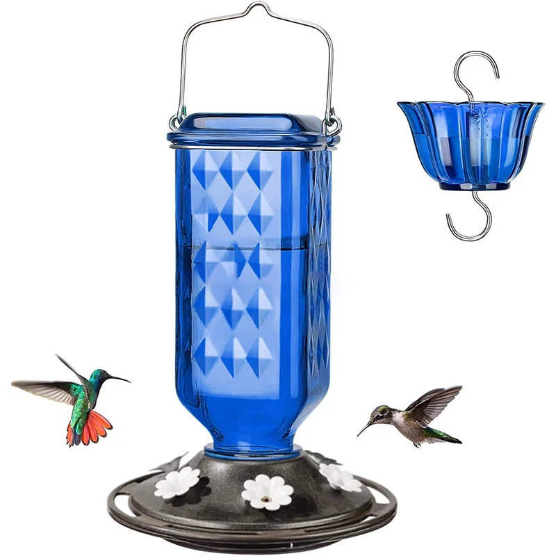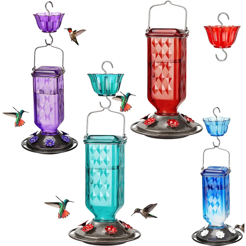 1. Eye catching design: High quality nectar glass container with beautiful appearance, 6 flower shaped feeding ports, capable of accommodating various hummingbirds. Beautiful colors are available for selection.