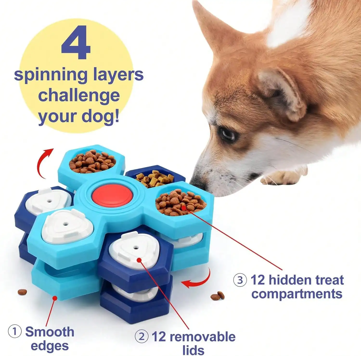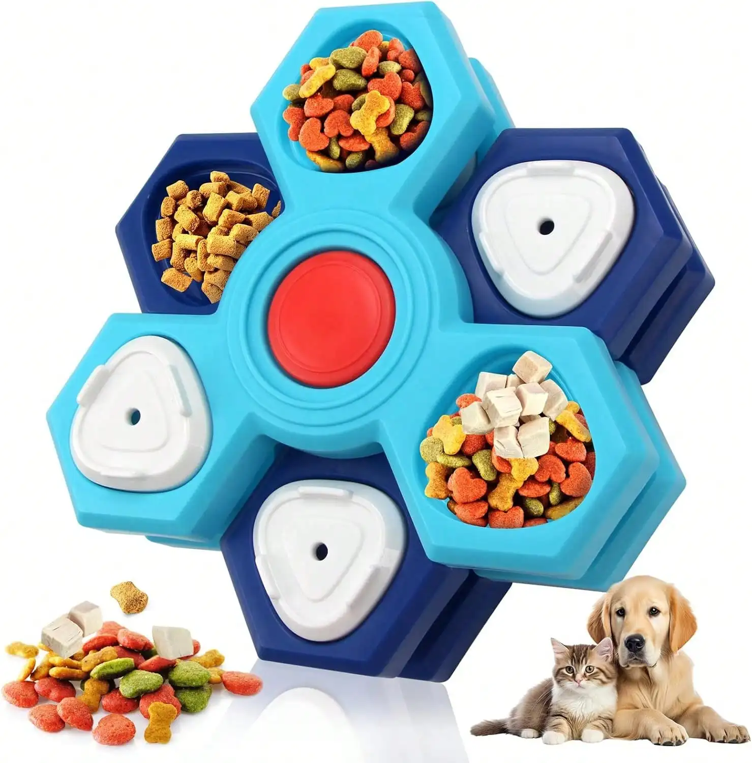 1、Interactive Enrichment: Features a multi-compartment hexagonal design with rotating elements that challenge your pet’s problem-solving skills to find hidden treats and kibble.