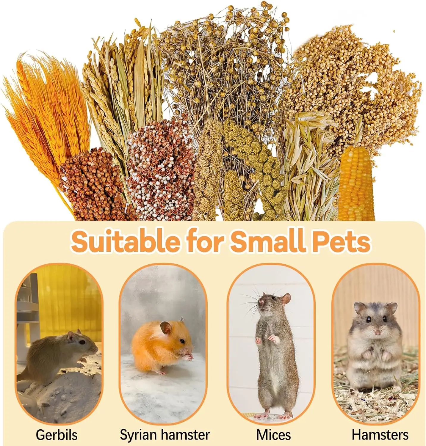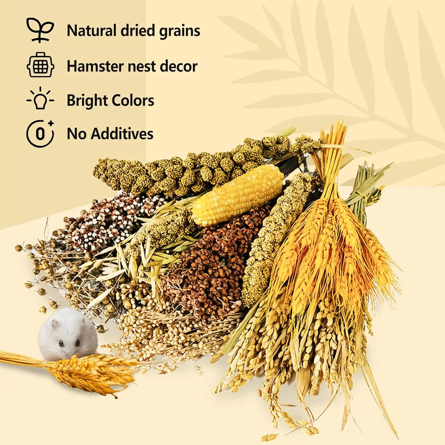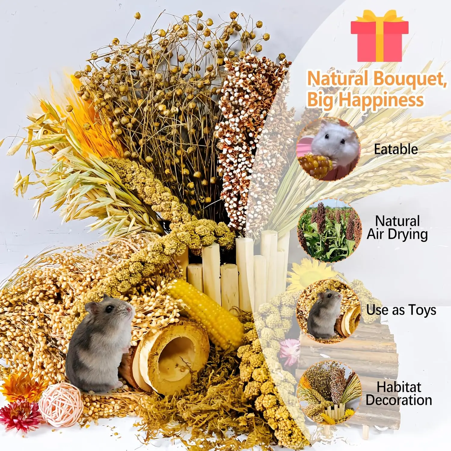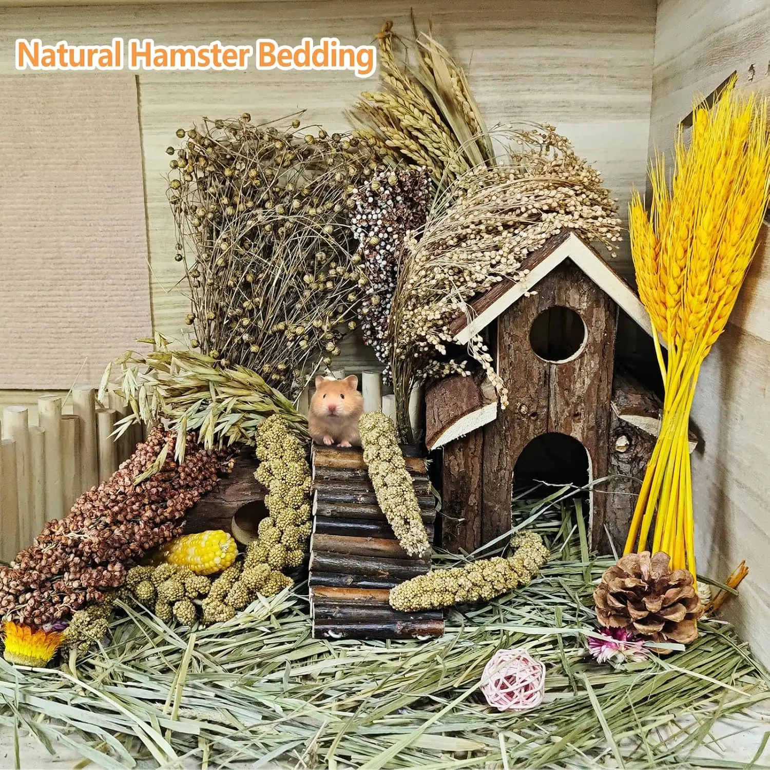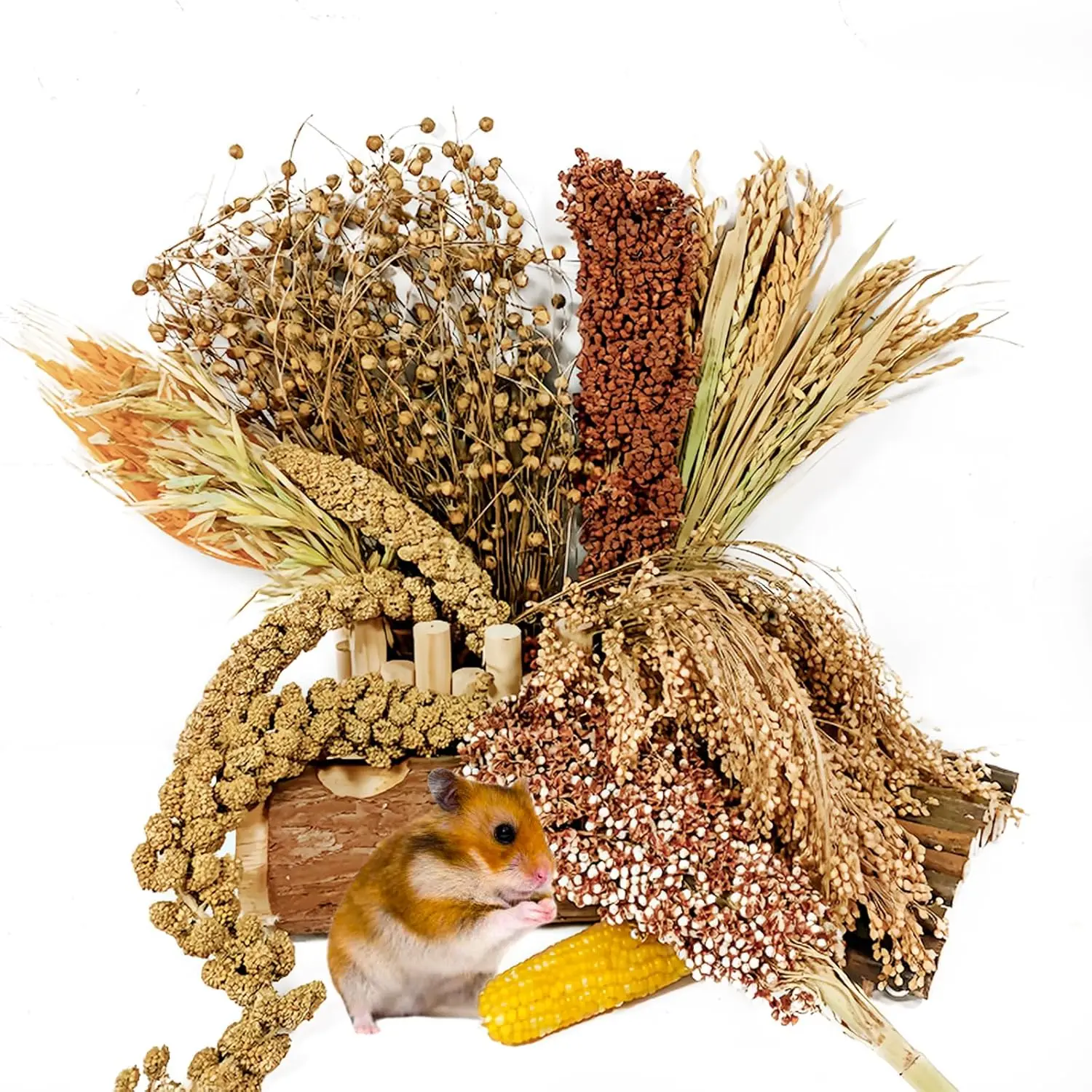 SET INCLUDES: You’ll receive 9 different types of plants: 3 Yellow Millet, 1 Red Sorghum, 1 White Sorghum, 15 Rice Panicles, 10 Oat Panicles, 10 Wheat, 50g Flax Seed, 50g Broomcorn Millet, 1 Small Corn.Placed in the cage, they can not only adorn the hamster’s home but also serve as new toys for hamsters, enriching their chewing experience.