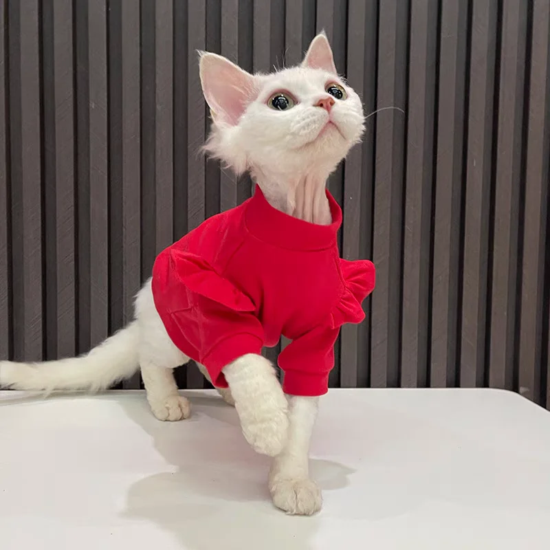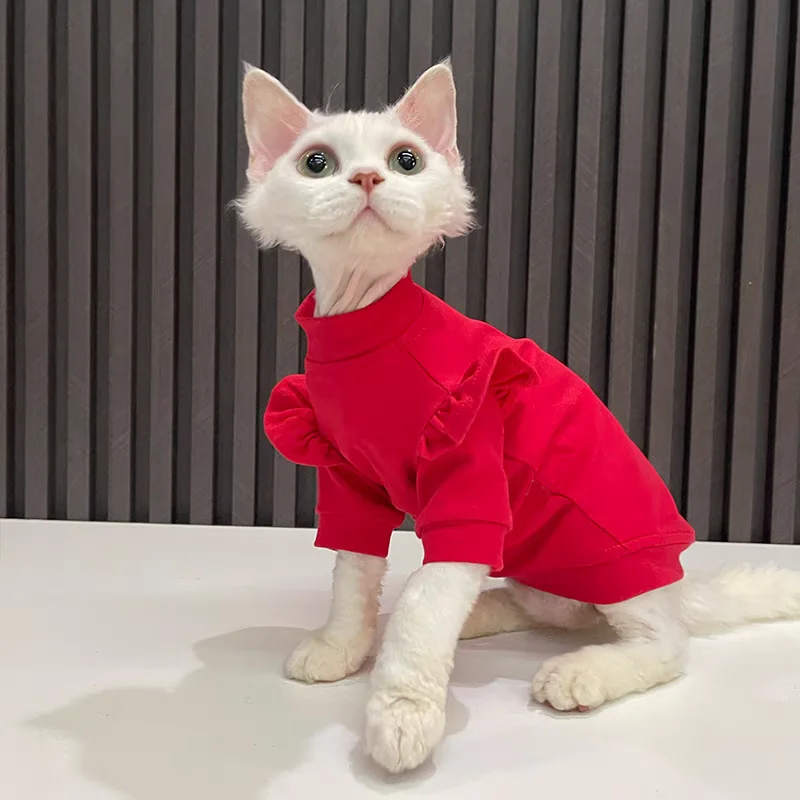 New Year Cat Clothing Ruffle Sleeves Cotton Clothes for Sphynx Winter Warm Sweet Sweater for Kittens Thick Coat for Devon Rex