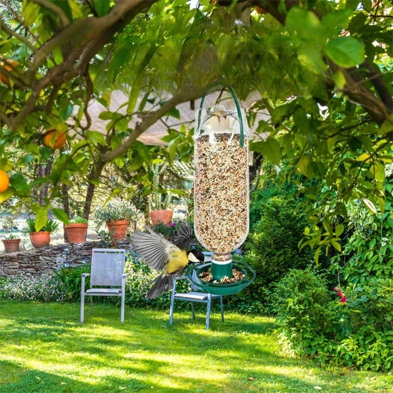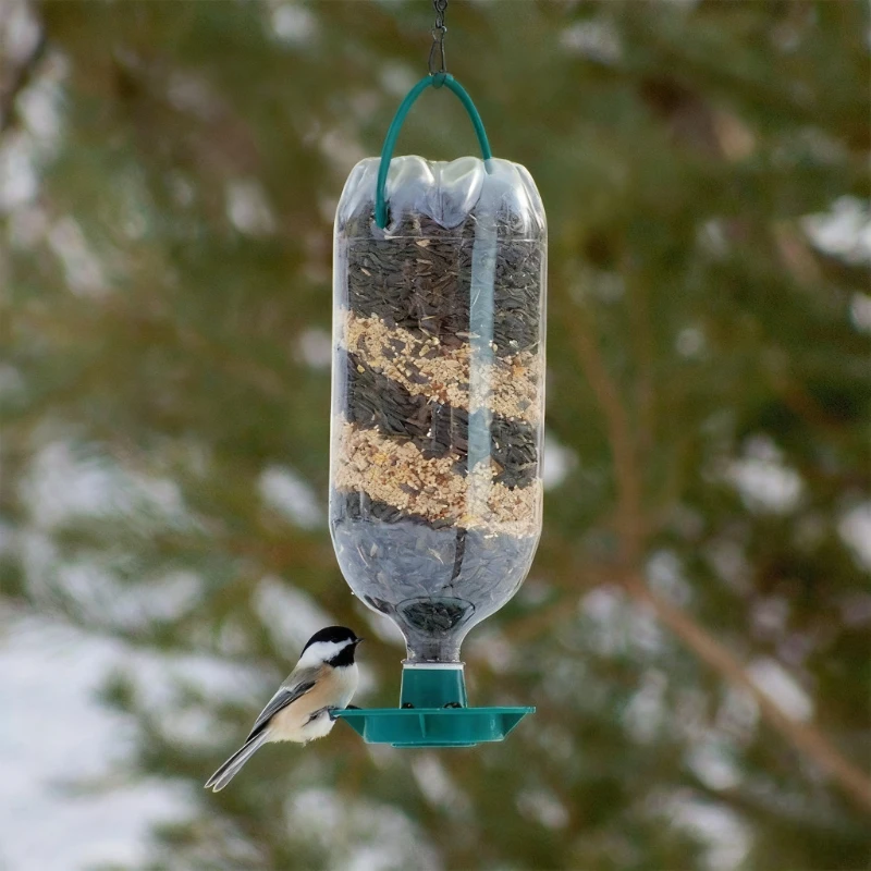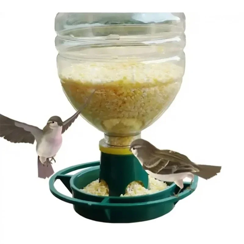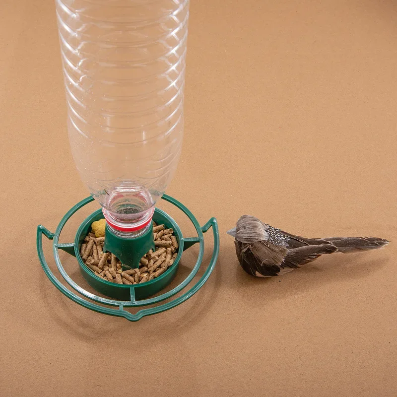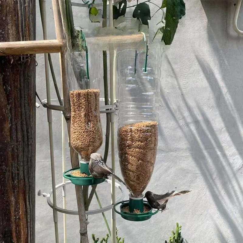 Its design is highly ingenious, with the green base not only serving as a resting platform for birds, but also as a discharge outlet for seeds, allowing birds to conveniently feed. You just need to assemble the plastic bottle with a green base, fill it with the seeds that birds love, and hang it on the branches of your yard or garden to attract many cute birds such as sparrows, adding vitality and wildness to your outdoor space.