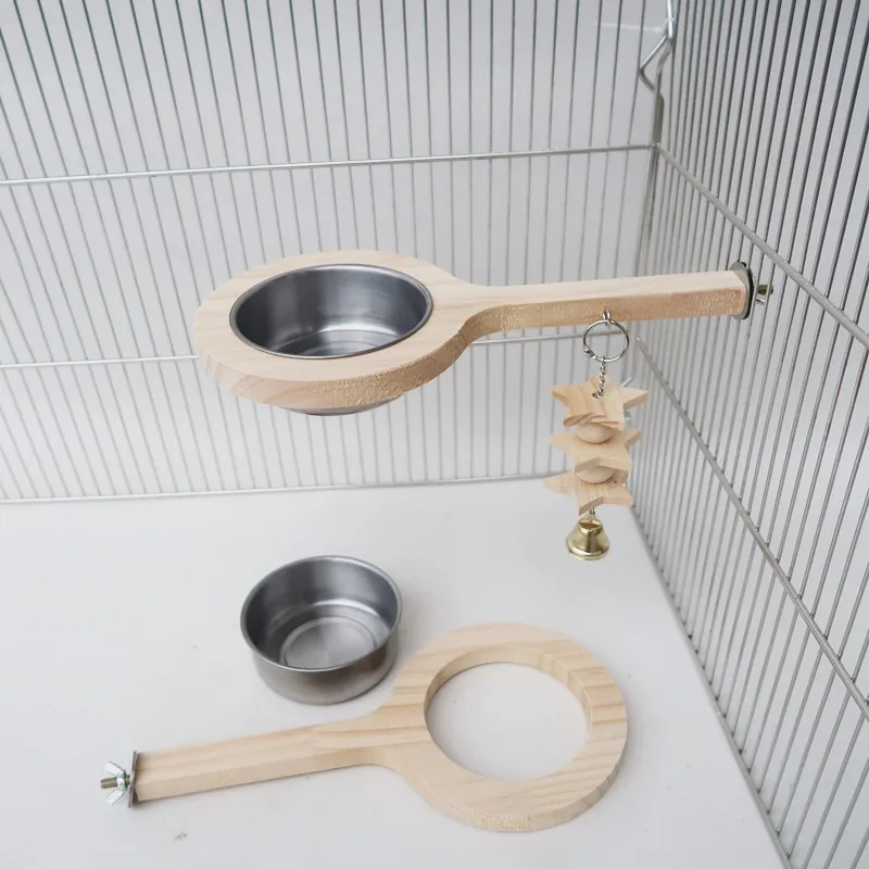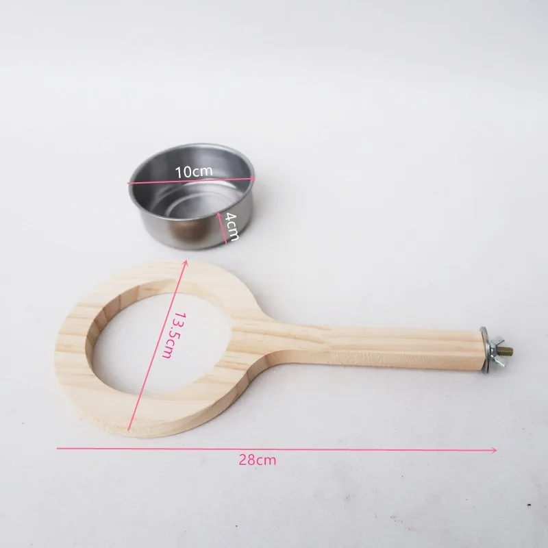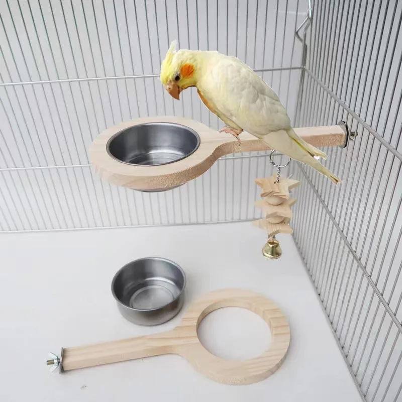 Parrot Bird Solid Wood Standing Stick Stainless Steel Feeder Natural Material Nibble Resistant Toy Stand Food Pot Pet Supplies