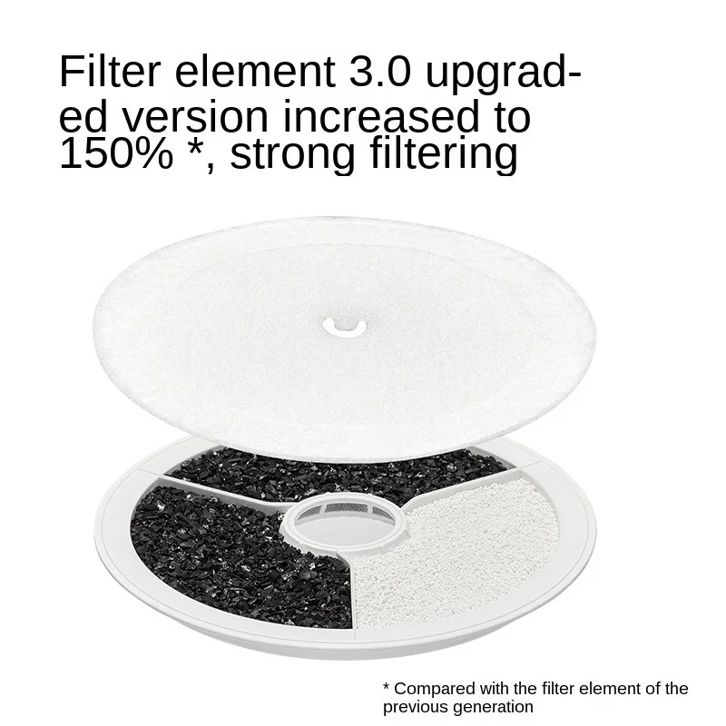 To prevent the activated carbon dust from shedding into water, please soak the cat fountain filter in water for 10 minutes then rinse thoroughly under running water before using. Replace every 1 to 2 weeks in summer and 2 to 4 weeks in winter. If multiple cats are using the fountain, more frequent replacement will be necessary. Please do not forget to reset the device, after replacing the filter.