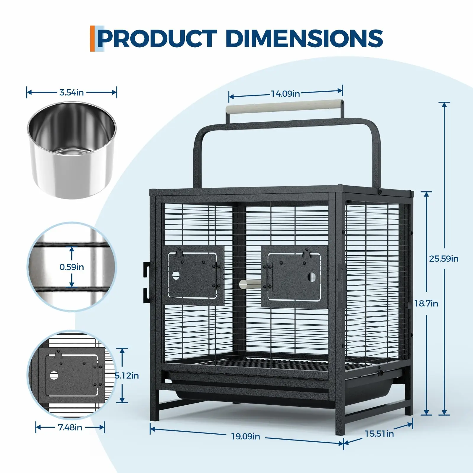 — Secure push-button door lock and 0.6" bar spacing ensure your bird's safety and prevent injuries during transport.