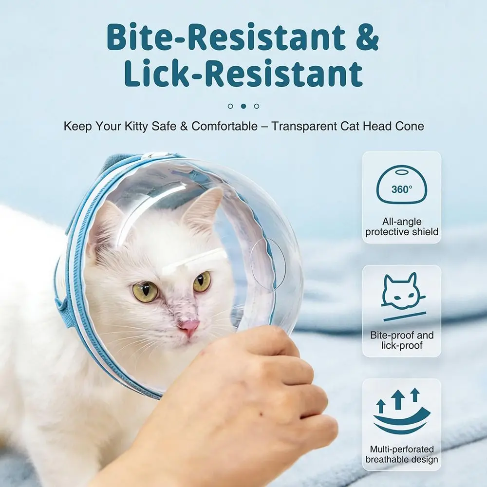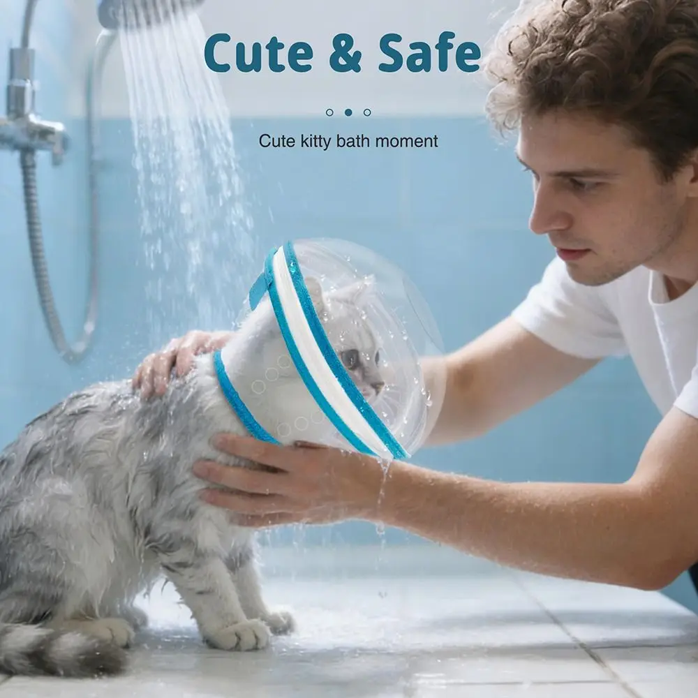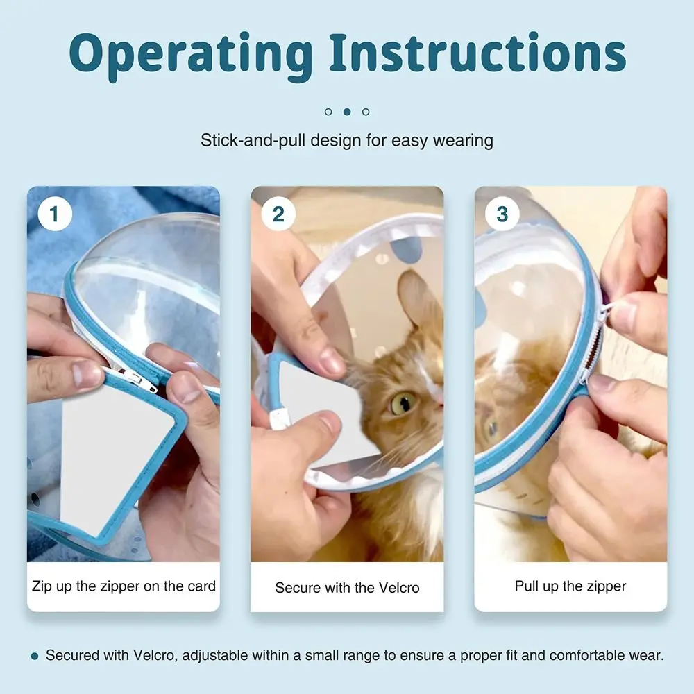 The transparent Elizabeth collar with an astronaut helmet, featuring a flannel design around neck to ensure soft and comfortable wear for your cat. The collar has tape for easy on and off, and there are no stickers on the collar, so you don’t have to worry about your cat licking or scratching them. The connection between the collar and the helmet is a zipper, making it easy to wear