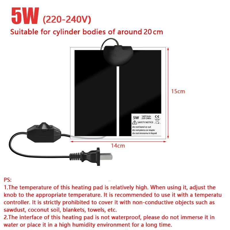 It can heat pet snakes, horned frogs, spiders, and insects. The surface temperature of the heating pad can reach 32 degrees Celsius, and insulation work needs to be done. For indoor temperatures that are very low, ceramic lamps should be used as much as possible for heating.