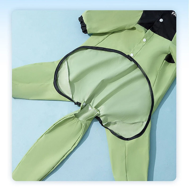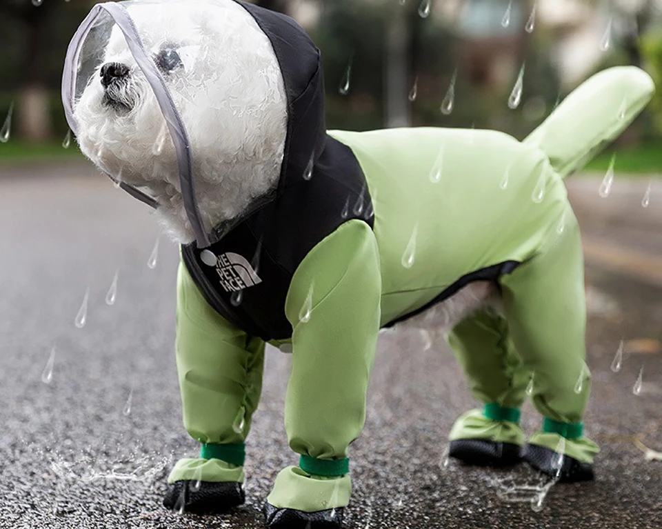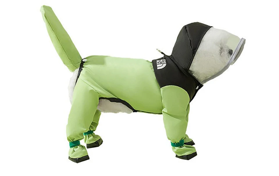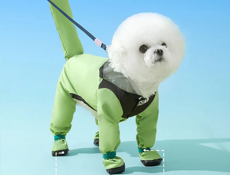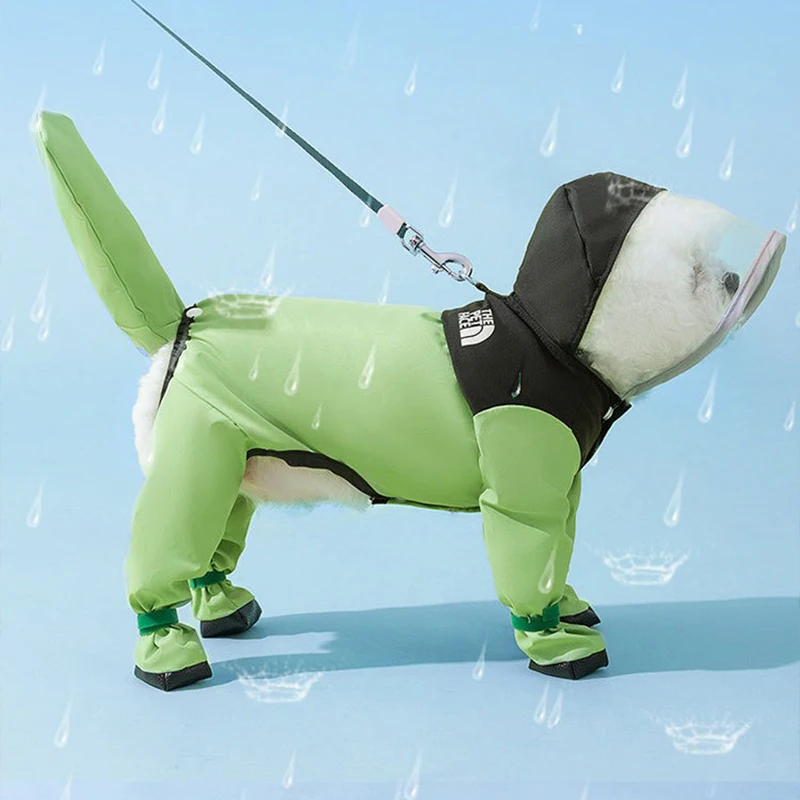 Pet raincoat color-blocking one-legged dog raincoat, four-legged all-inclusive small dog teddy, for rainy day outings. Clothing colors: green, blue