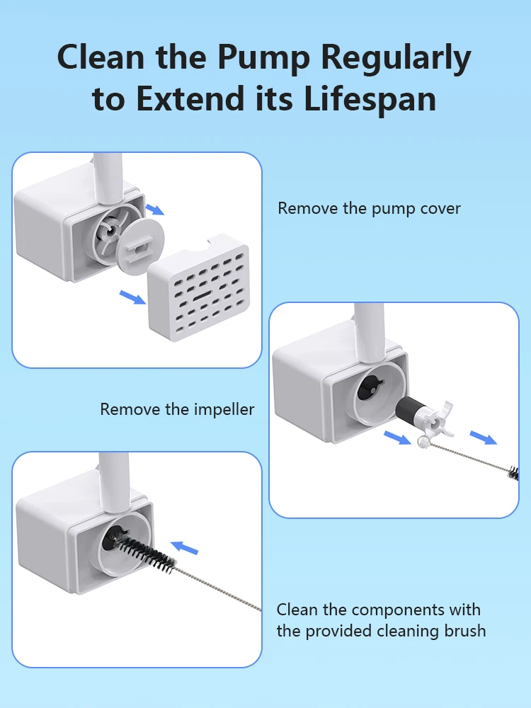 Clean detachable parts (tank, cover, filter, pump) before first use