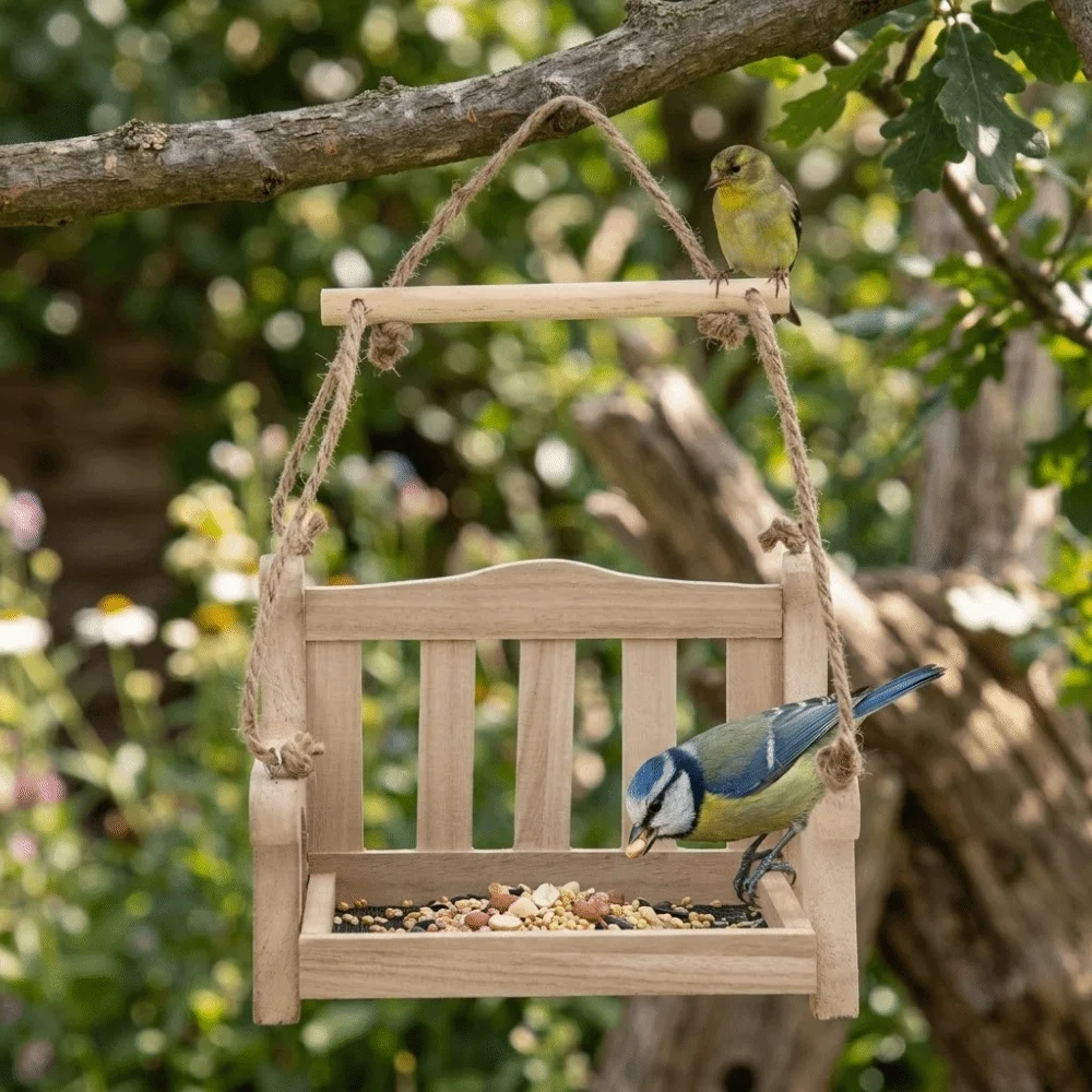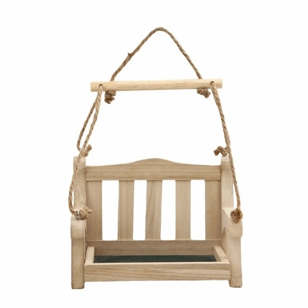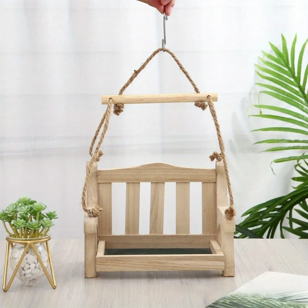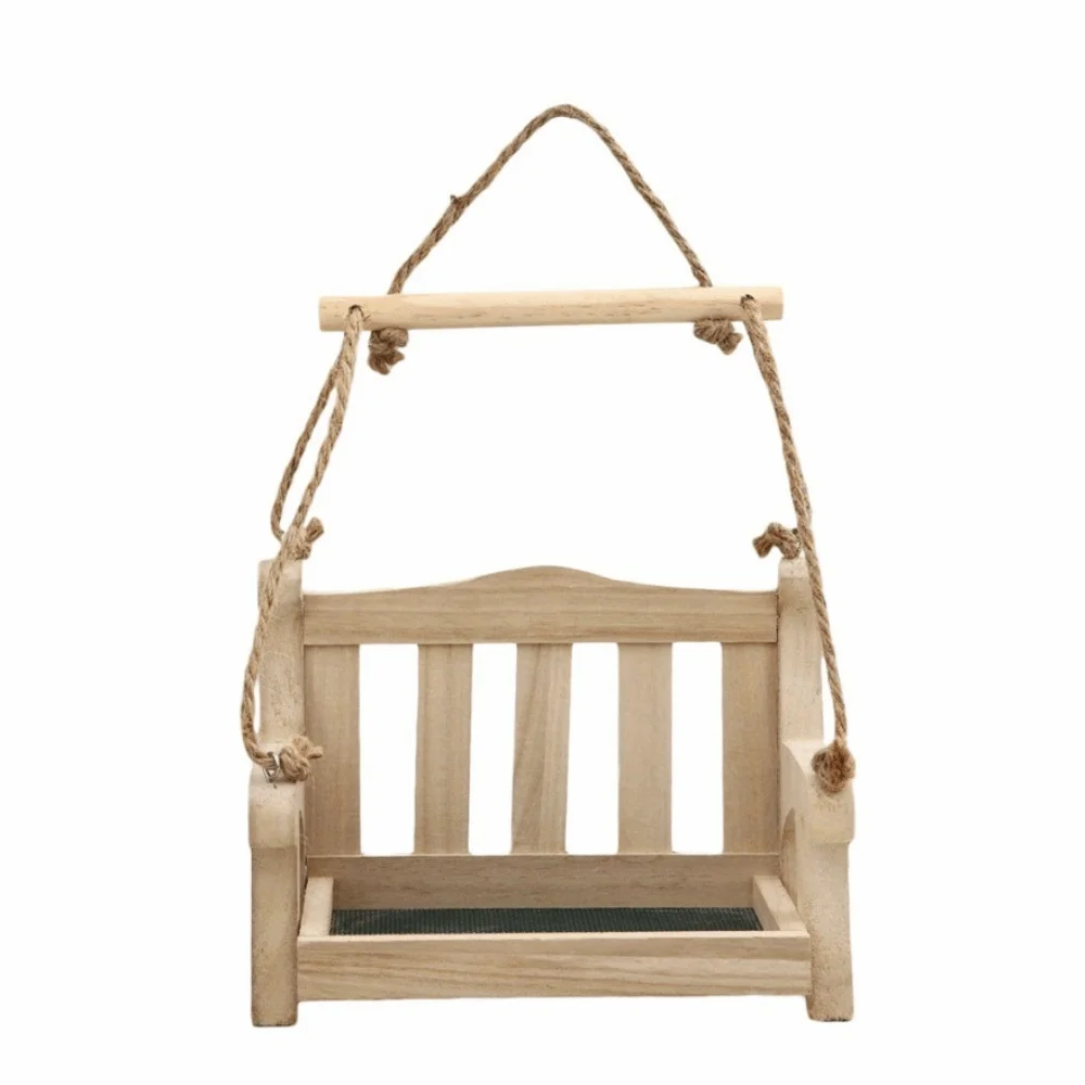 Wooden Hanging Bird Feeder Chair Design Large Capacity Bird Food Container Creative Rest Stand Bird Feeding Station Porch